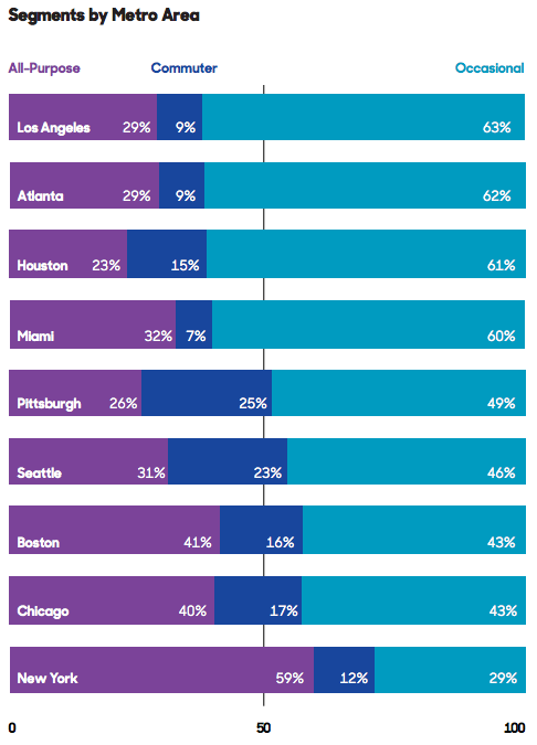…occasional riders who take transit once in awhile, commuters who take transit regularly but only for work, and all-purpose riders who take transit regularly for multiple reasons. The mix of these groups varies significantly by city:
