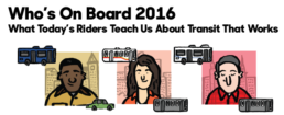 That’s the main conclusion of “Who’s On Board 2016: What Today’s Riders Teach Us About Transit That Works,” the latest edition in TransitCenter’s Who’s On Board series of national transit rider opinion studies. Drawing on results from three focus groups and a survey of 3,000 people in 17 metropolitan areas across the country, Who’s On Board offers several core findings to inform how government agencies and elected officials approach transportation, land use, and development policy.