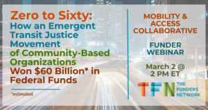 Join the Mobility and Access Collaborative, a TFN initiative, at 2 p.m. ET March 2 for Zero to Sixty: How an Emergent Transit Justice Movement of Community-Based Organizations Won an Estimated $60 Billion in Federal Funds.