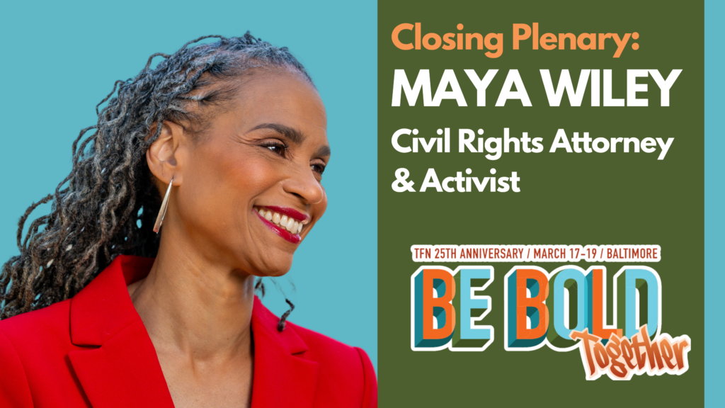 We are thrilled to announce that Maya Wiley, a nationally respected civil rights attorney and activist, will join us in Baltimore to close out TFN’s 25th Anniversary Conference: Be Bold Together!