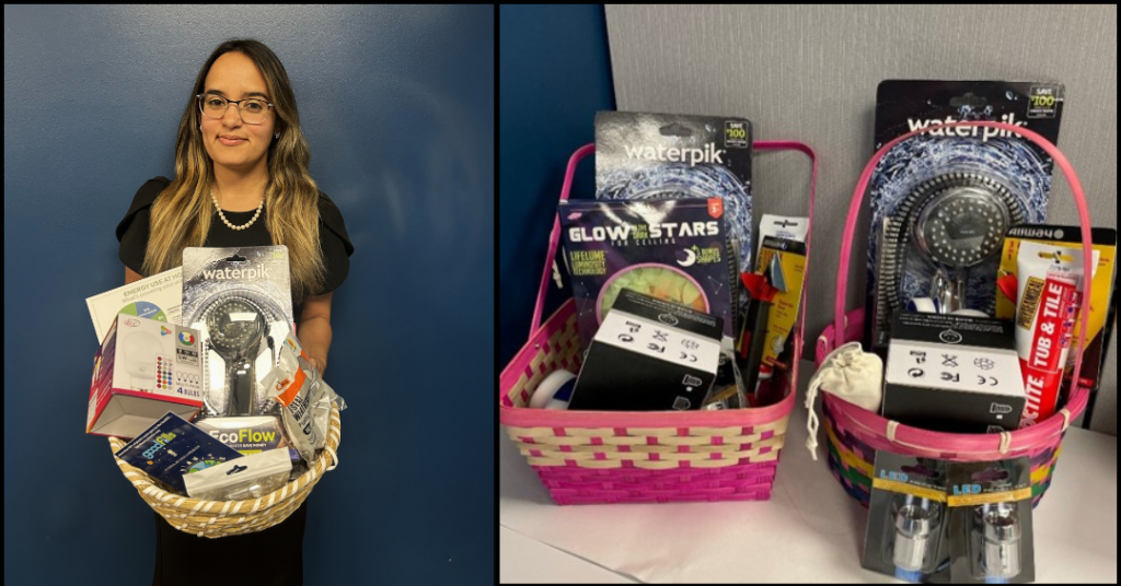 Ashley Perez, energy policy coordinator with the City of Orlando, carries one of the energy efficiency baskets that will be distributed to low-income households with the support of Partners for Places funds. Photo credit: City of Orlando.